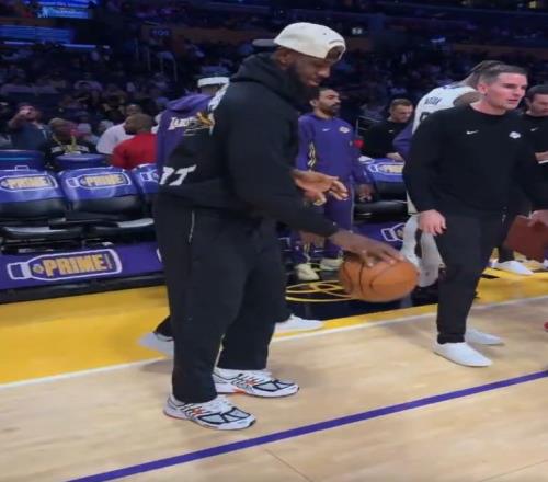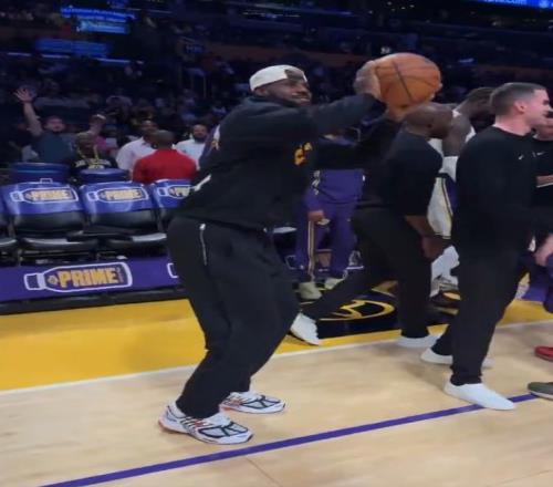 勒布朗抓住比赛间隙的时间,把帽子反戴,拿球开始练起了三分投篮,最后球应声入网。