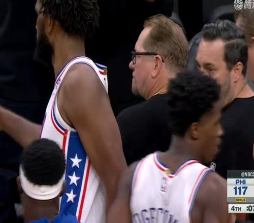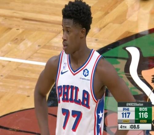 关键对面凯尔特人没有塔图姆,你面对的是没有波神,没有霍福德的凯尔特人,中锋是蒂尔曼你在那哐哐投,你连他都打不了,那全联盟就没有你能打得过的内线了。此时不得不提到一个人,费城76人刚选的新秀VJ-埃奇库姆,他打了42分钟拿了34+7+3。
